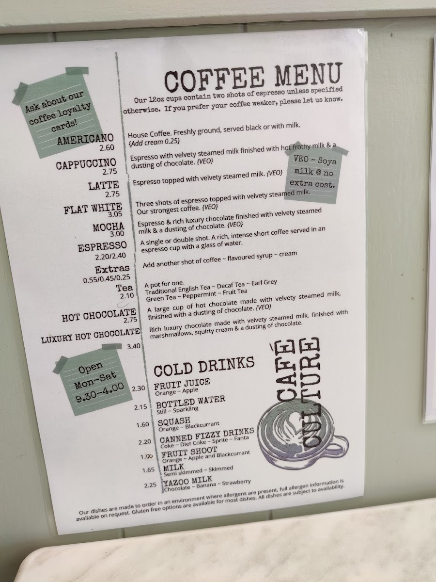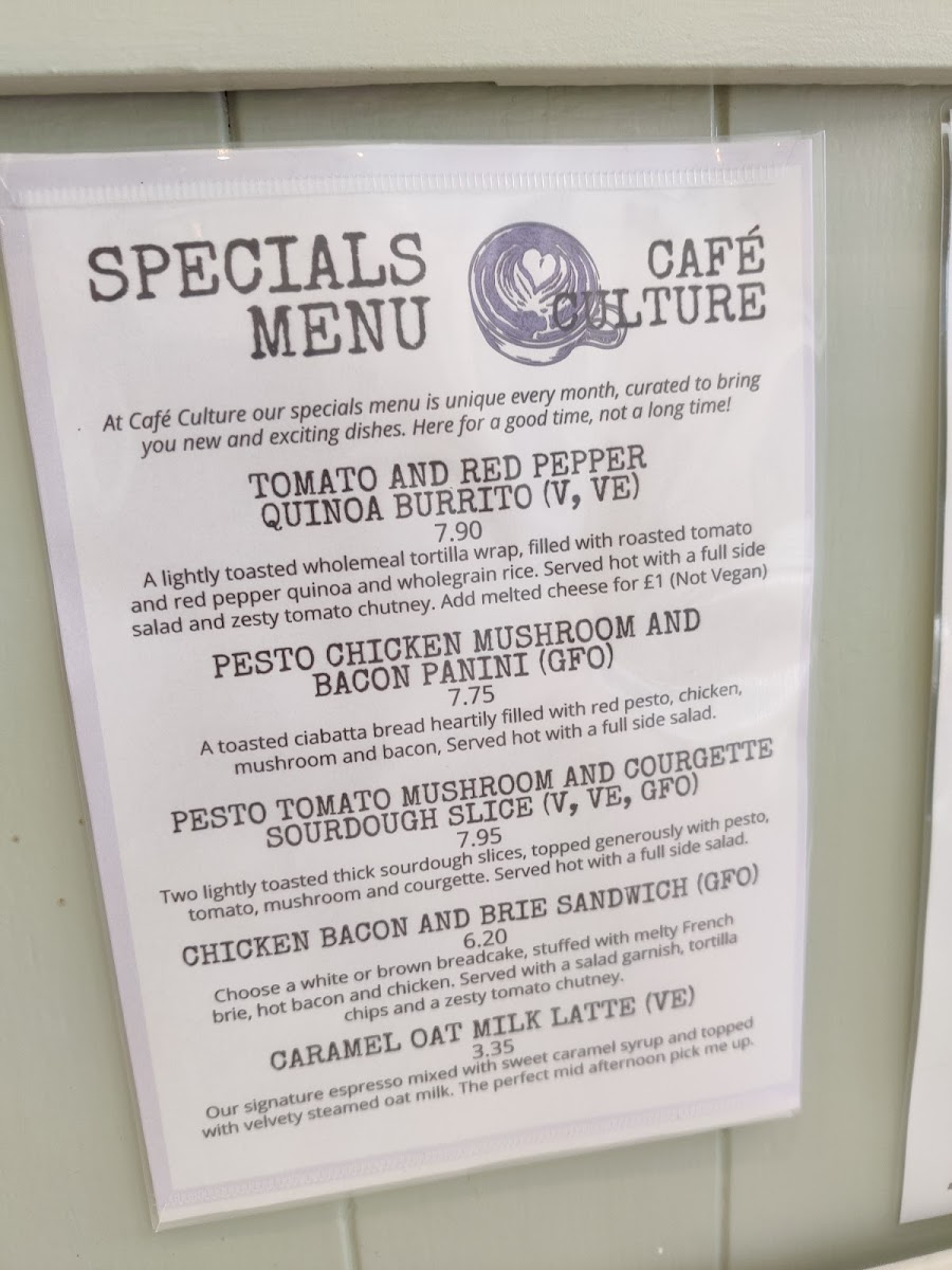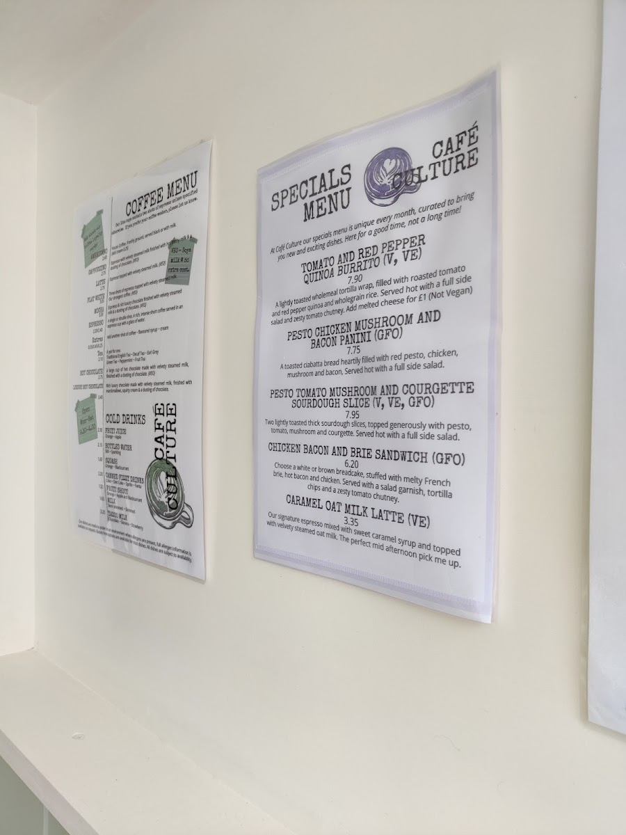 At Café Culture @ Inspiration Café Bar, the menu offers a delightful variety of options to suit every taste, ranging from refreshing cold drinks to savory specials. Their Cold Drinks section features a selection of beverages perfect for quenching your thirst, including Fruit Juice, Bottled Water, and Squash Canned Fizzy Drinks. For those seeking something more filling, the Specials Menu is where the real flavor begins, with dishes that cater to a variety of cravings. The Tomato And Red Pepper Quinoa Burrito brings together vibrant vegetables and quinoa in a hearty wrap, while the Pesto Chicken Mushroom And Bacon Panini combines rich flavors of pesto, tender chicken, mushrooms, and crispy bacon. For something lighter, the Pesto Tomato Mushroom And Courgette Sourdough Slice is a fantastic choice, offering a delicious mix of fresh ingredients on a toasted slice of sourdough. Meat lovers will enjoy the Chicken Bacon And Brie Sandwich, a savory and creamy combination that hits all the right notes. To accompany your meal, the café offers a selection of coffee drinks, such as the smooth Americano, velvety Latte, frothy Flat White, indulgent Mocha, and the classic Espresso. For those looking for something a bit different, try the Caramel Oat Milk Latte, a sweet and creamy drink perfect for those avoiding dairy. Whether you're in the mood for a quick snack or a satisfying meal, Café Culture's menu promises a satisfying experience with its range of flavors and comforting drinks.